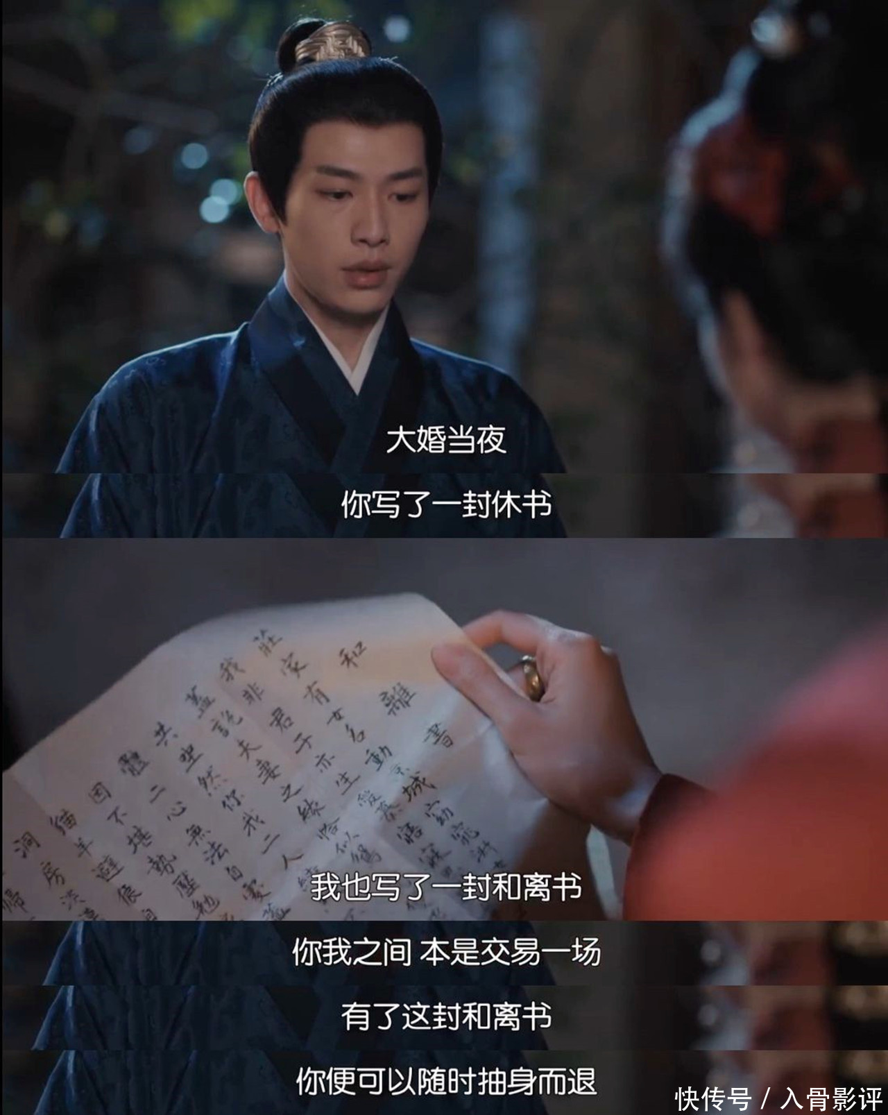 剧情在最后五集填补了更多感情线细节。虽然前期彼此利用,但在利用之时也为对方考虑了后路。各自写下休书和离书,故事到最后终究还是真心居多。