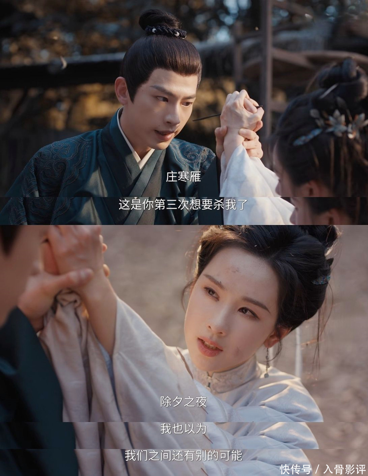 而真正让她态度发生变化的是除夕之夜。庄寒雁生命里有两个最重要的人,一个是最渴望的亲情,也就是阮惜文;另一个是最接近亲情的友情,也就是在儋州相依为命的柴靖。除夕之夜,傅云夕带她钻狗洞看望重伤的柴靖。他明明嘴上说不会做饭,行动起来却比谁都积极。在她的视角里,虽然他的接近或许有别的目的,但在此刻他是她入京以来最了解她的人。所以在后来庄寒雁救母时,她说以为他们之间有别的可能。